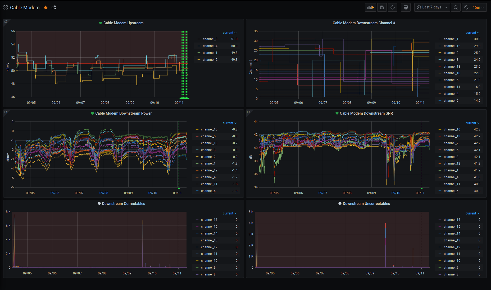 Recently I got the itch to learn something new and I chose to explore Grafana. Of course, I needed something to graph or make a dashboard out of. So I pondered for a while and during that time I had some trouble with my internet connection. This of course had me looking at my cable modem stats page and that’s where I found my inspiration. So many numbers that are a point in time snapshot that I wished I had a historical graph of. So I set about figuring out how to install Grafana in docker and pull the data in. I quickly found that grafana is a display thing and not a collector and display. This meant that I had to collect the data and store it so that grafana could display it. For this, I figured I could store it in MariaDB, as using that in grafana looked simple enough. The problem I had was getting the data off of the modems stats page. I plinked around with a bash script and a python script, neither did that great for me. About this time I remembered that nodered has some power to it and tried that. I managed to pull the data and store it into MariaDB via nodered. I then managed to display the data via grafana and was rather satisfied with myself.