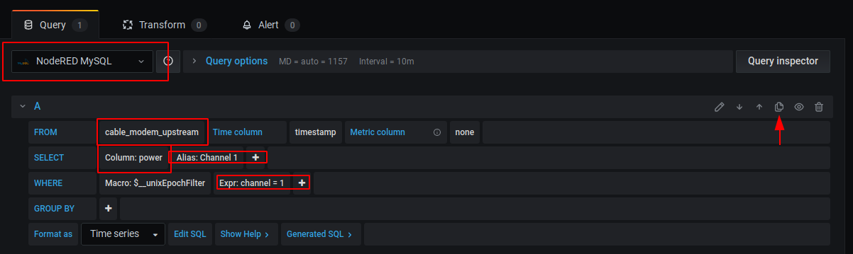 On the new screen that appeared, I made sure to select the new mysql data source just below the query tab. From there I started just clicking around and found that it was kind of a GUI SQL builder. I set the table as cable_modem_upstream, chose the power column, gave it an alias of Channel 1, and then set the expression of channel = 1. I hit the copy button three times and change the Channel 1 to a Channel 2, etc, and the channel = 1 to channel = 2, etc. I gave the panel a title and hit save then apply. My first panel and it looked wonderful.