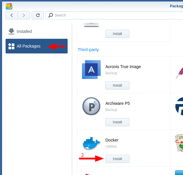 First thing, install docker if you do not have it already installed. Open the package center and in the third party apps section.