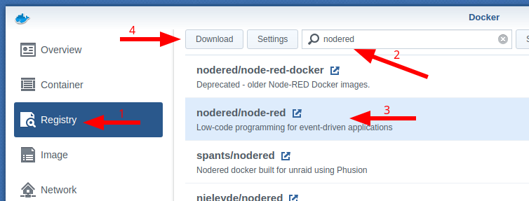Example search node-red and you should find nodered/node-red in the list. Click it, then click the little popout icon to go to the page and see if there are any listed environment variables you might need/want to set. Then click download. Repeat for all 3 images.
